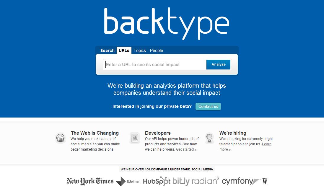 BackType specializes in the development and launch of advanced systems designed for analyzing social media.  The company has also established itself as one of the most effective marketing intelligence systems and services providers specializing in social media analysis as well.  This is a company worth tracking as they will be a disruptive force in social media analysis and market intelligence.